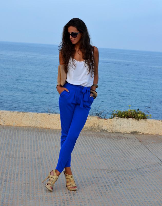 Una de las opciones más clásicas a la hora de combinar un pantalón azul eléctrico es el color blanco. ¡Será un acierto seguro! El blanco hará que la fuerza del color azul resalte todavía más.