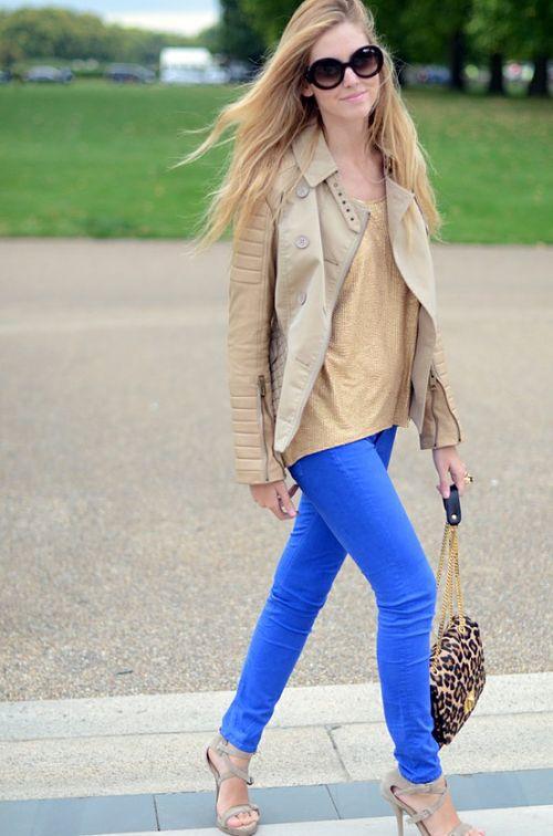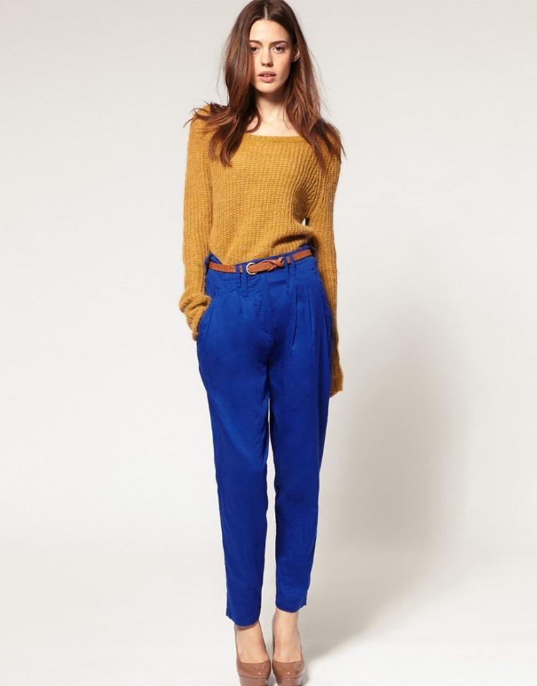 Puedes conseguir un look más rompedor si combinas tu pantalón azul eléctrico con una parte de arriba de color mostaza.
