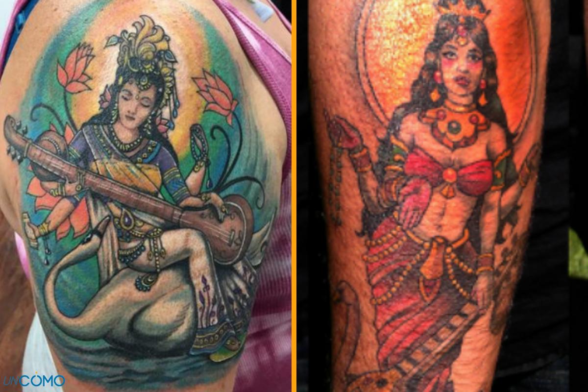 Si te gusta todo el mundo y la estética hindú y eres un apasionado del arte, la música y el conocimiento, sin duda la diosa que más te puede representar para que te la puedas tatuar es Saraswati. Esta diosa siempre se representa sentada en la popular flor de loto y tocando el instrumento veena con sus cuatro brazos. Es un tipo de diseño que suele hacerse en un tamaño mediano-grande pero que, por su composición, suele ser más redondeado, por lo que es ideal para hacerlo en la espalda.