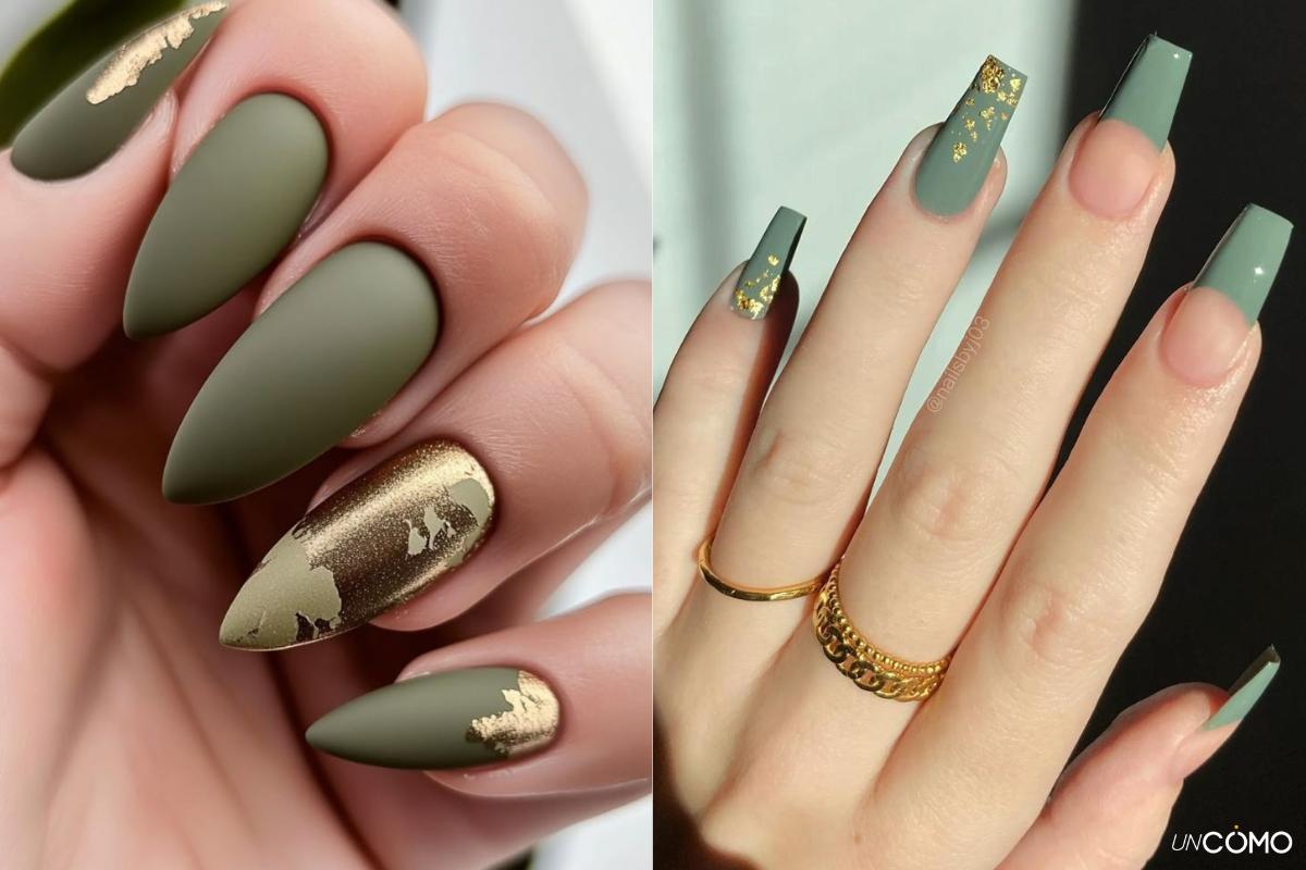 - Uñas verde oliva con dorado