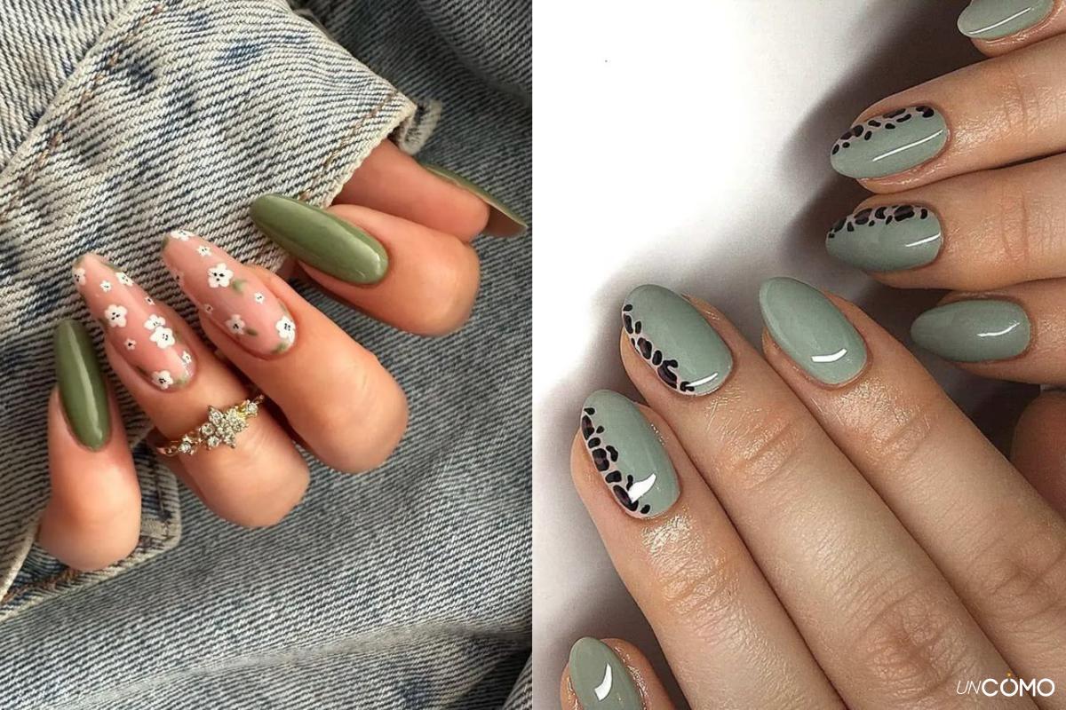 - Uñas verde oliva con estampados