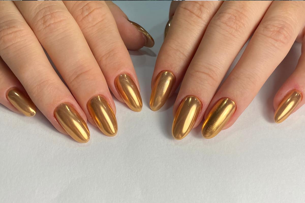 Las uñas doradas con efecto espejo son perfectas para quienes buscan un toque de lujo y sofisticación en su manicura. El dorado es un color cálido y elegante, ideal para eventos especiales como bodas, fiestas o celebraciones importantes. Este tono funciona especialmente bien para ocasiones nocturnas, ya que el brillo dorado destaca con la iluminación y aporta un toque de glamour al look. Este estilo es ideal para personas con tonos de piel cálidos, pues el dorado armoniza y complementa este tipo de tonos. Sin duda un símbolo de distinción y clase.