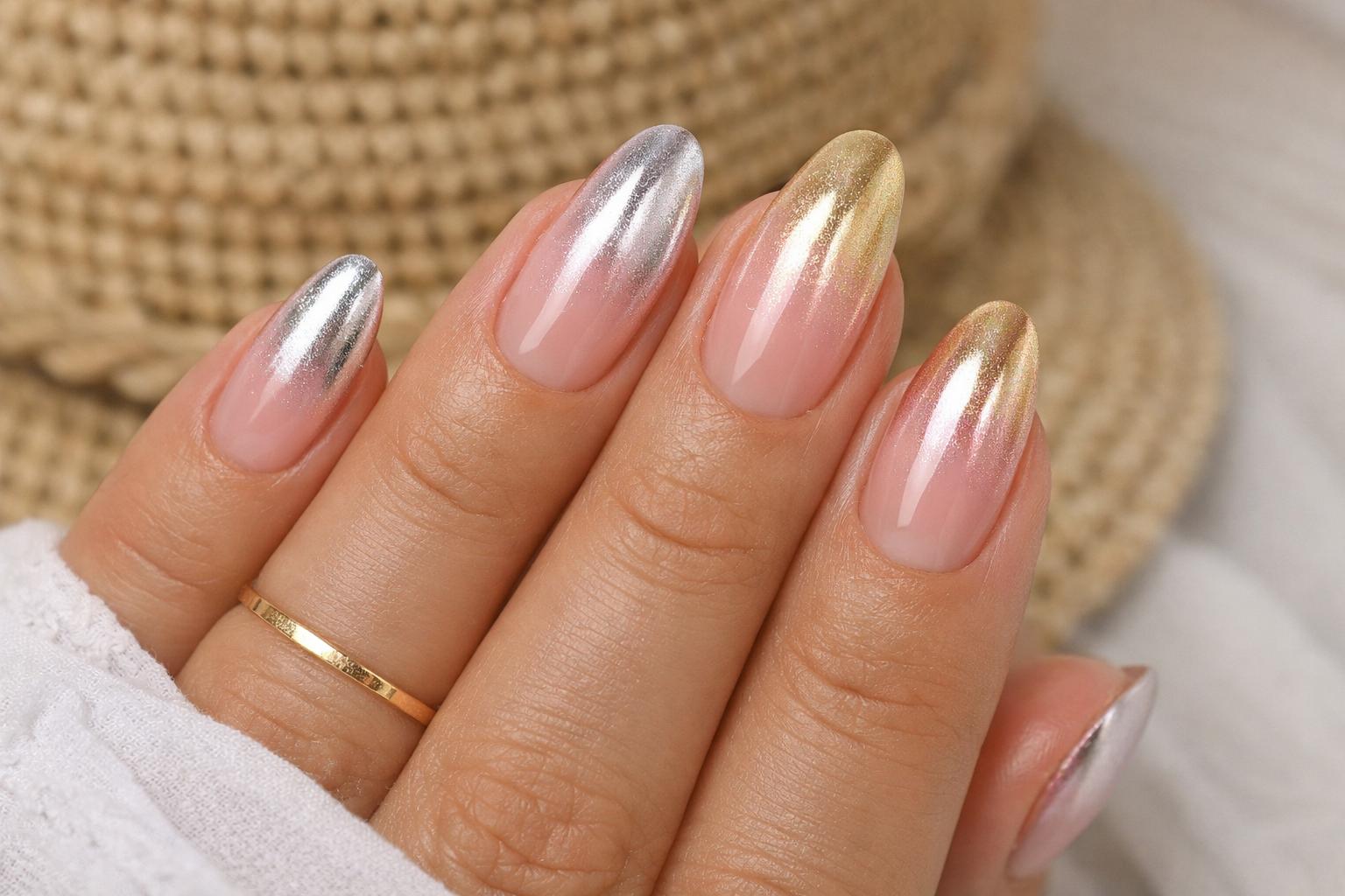 El degradé cromado (u ombré) es una de las técnicas más creativas y visualmente dinámicas del momento. Se logra aplicando el polvo metálico de forma gradual, ya sea vertical u horizontalmente, para crear una transición suave entre dos tonos.