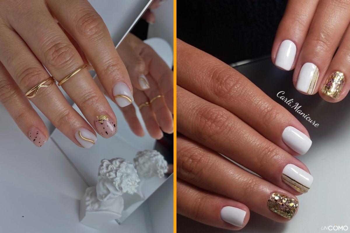 Los detalles dorados son sinónimo de elegancia y sofisticación. Puedes incorporarlos en líneas finas, figuras geométricas o pequeñas aplicaciones metálicas. También puedes combinarlos con esmaltes en tonos oscuros como negro, burdeos o verde botella para un contraste llamativo y chic. Este tipo de manicura es ideal para eventos especiales o para quienes buscan un look más refinado en su día a día.