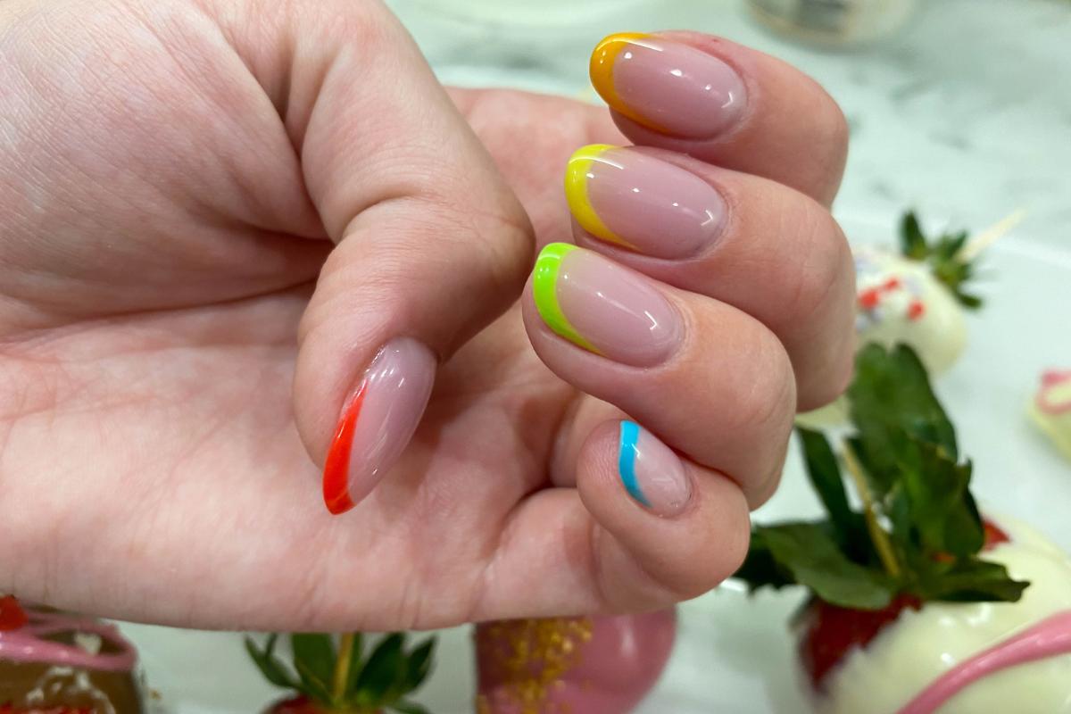 La manicura francesa se reinventa con esta versión colorida. En lugar de la clásica línea blanca en la punta de las uñas, se aplican colores del arcoíris, uno distinto en cada uña o incluso varios combinados en una sola.