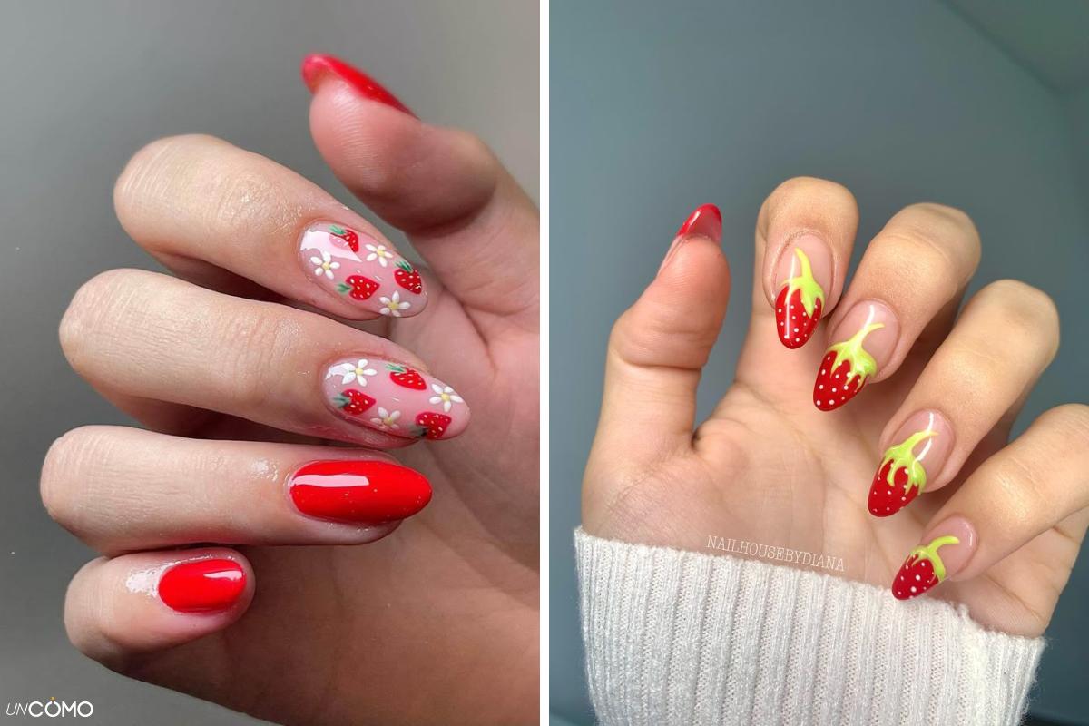 Las fresas son dulces y románticas, y sus diseños en uñas transmiten esa misma sensación. La base roja con pequeños puntos blancos y hojas verdes en la parte superior es la forma más tradicional de representarlas. También puedes combinar el diseño con esmalte rosa para una versión más suave y femenina. Estas uñas de verano quedan preciosas en eventos informales, picnics o vacaciones en la playa.