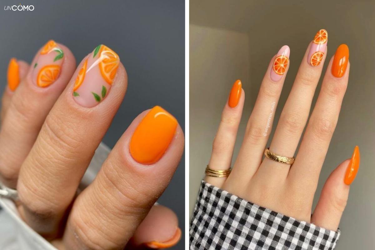 Las uñas de naranja siguen un concepto similar a las de limón, pero con tonos más cálidos y vibrantes. Puedes optar por un diseño que muestre medias lunas de naranja o por un degradado en tonos naranjas y blancos que imite el jugo de esta fruta. Si quieres darles un toque más sofisticado, añade un esmalte con acabado brillante que recuerde a la jugosidad de la fruta.