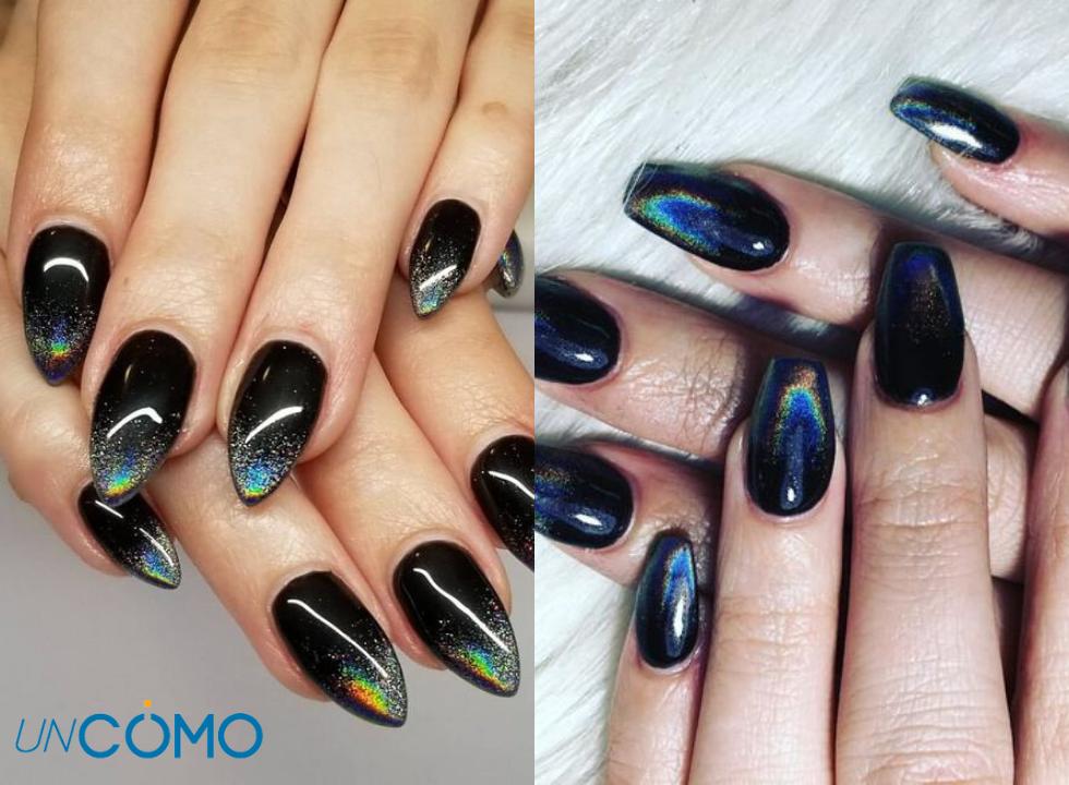 La manicura holográfica también es perfecta para crear diseños que inspirados en las estrellas, la galaxia y el cielo nocturno. Combinar los polvos holográficos con un esmalte negro le dará a tus uñas un look dramático, elegante y muy vistoso. Puedes pintar solo una de las uñas con esmalte holográfico o hacer un degradado entre ambos esmaltes.