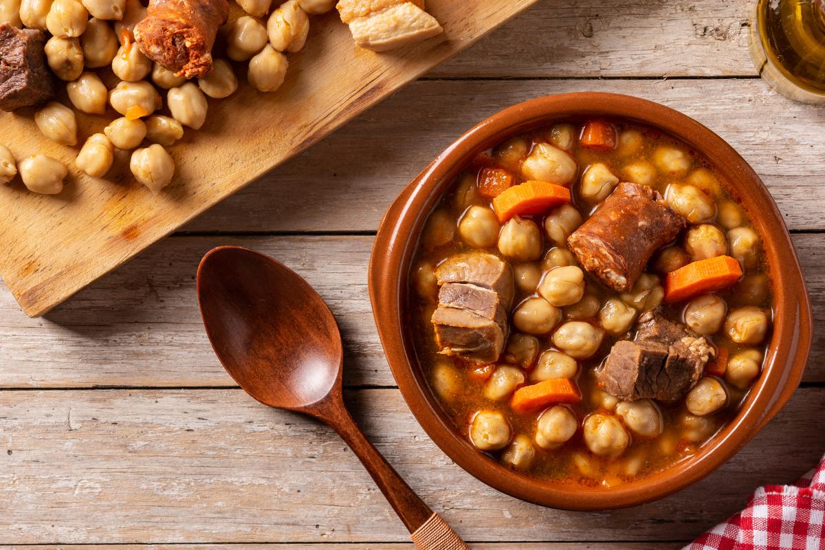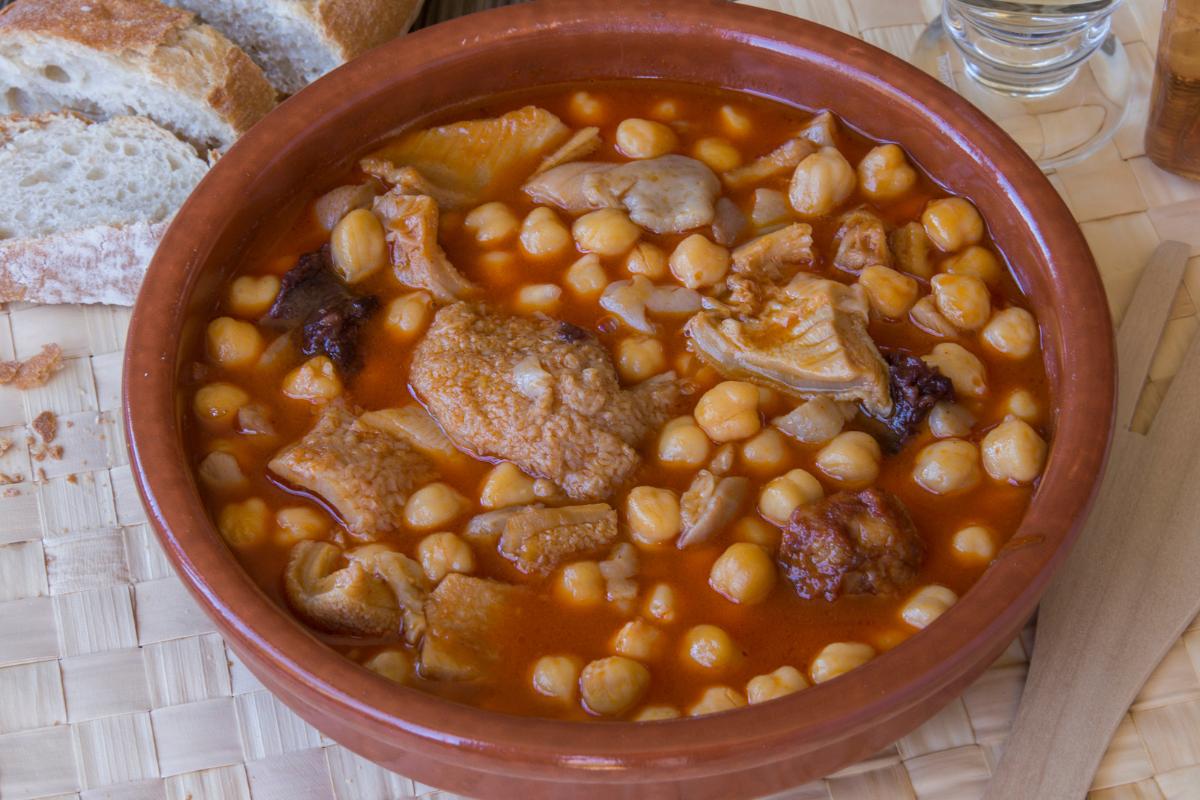 Este plato es típico durante los meses de invierno en Sevilla. Se elabora en un puchero de barro o una olla con diferentes carnes cortadas de ternera y cerdo, un hueso de jamón, morcillas, chorizos, un sofrito de cebolla y tomate y garbanzos. Se deja cocer y una vez está casi hecho, añades una pizca de hierbabuena y perejil. Es un plato sabroso y consistente que permite quitar el frío y saciar el apetito.