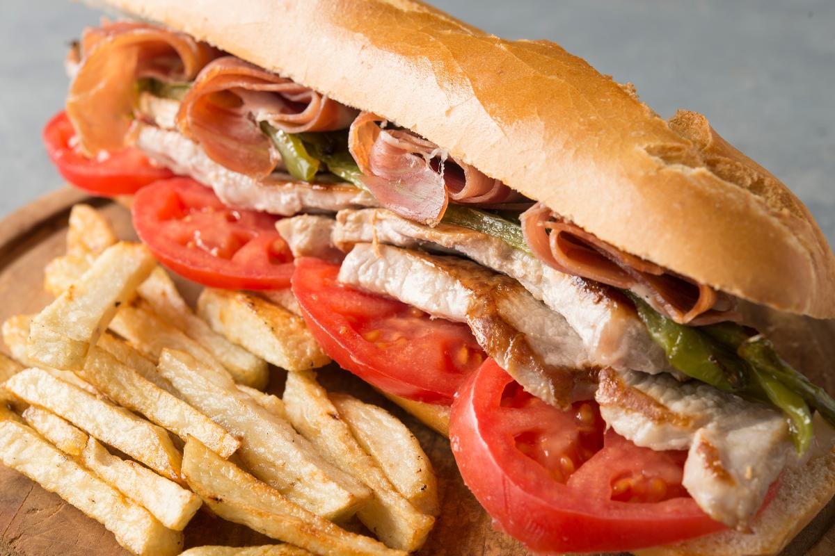 El serranito es un emblema de Sevilla. Consiste en rellenar un pan de mollete con lomo de cerdo a la plancha, rodajas de tomate, lonchas de jamón ibérico o serano y pimiento frito. Un bocadillo muy consistente que se acompaña de patatas fritas.
