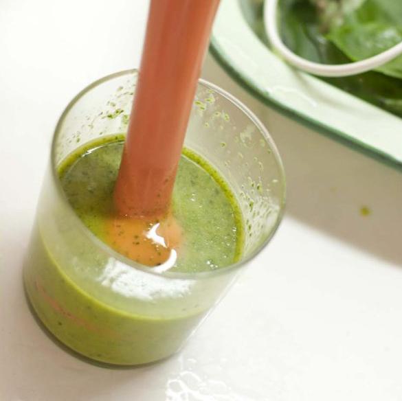 Cuando las hojas se hayan escaldado un poco, enfríalas introduciéndolas en un recipiente con agua y hielo. Escúrrelas bien para eliminar el exceso de agua y tritúralas. Puedes machacarlas con la licuadora, con la batidora o manualmente con un mortero, como te vaya mejor.