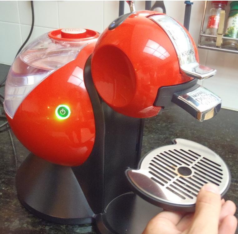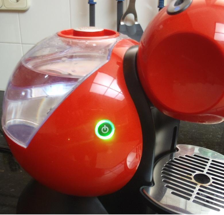 Para hacer café con la Nescafé Dolce Gusto, encienda la máquina y asegúrate de que hay agua embotellada o filtrada en el recipiente. La máquina estará encendida cuando la luz del botón de encendido deje de parpadear con el color rojo y se ponga verde.