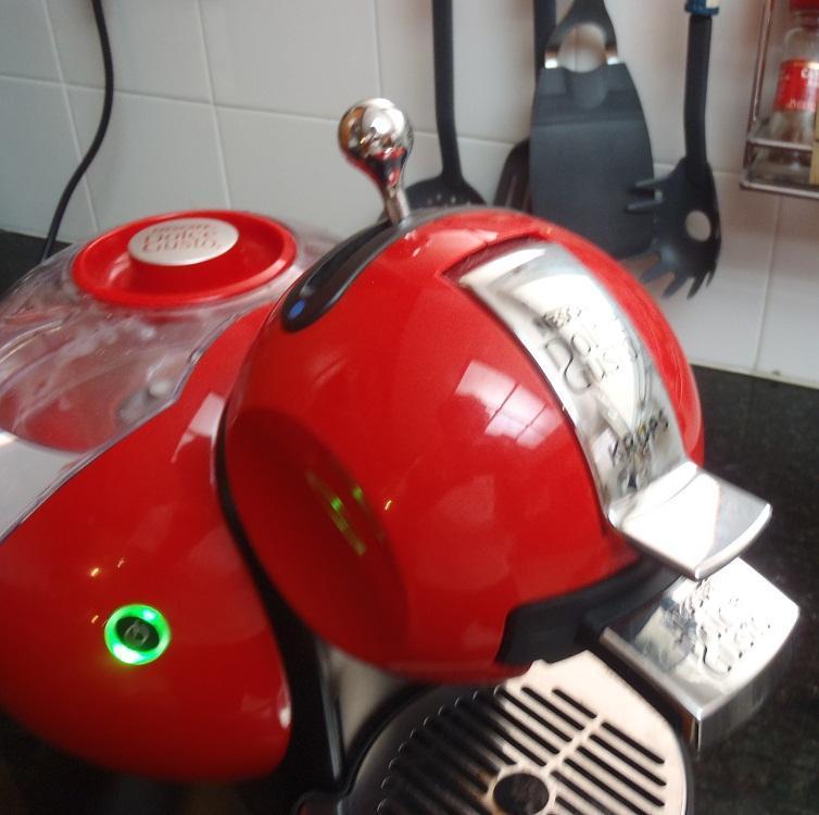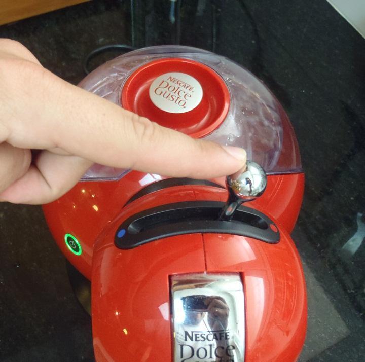 Una vez colocada la taza sobre el soporte, mover la palanca superior de la máquina Dolce Gusto a la derecha, si quieres que el agua salga caliente o a la izquierda si quieres la bebida es fría. En este caso mueves la palanca a la derecha, para hacer el café caliente.