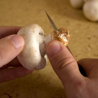 Lo primero que debemos hacer para limpiarlos correctamente es cortar el tronco de los champiñones, puesto que es la zona con más tierra acumulada. Simplemente coge un cuchillo afilado de tamaño mediano y corta el extremo del tronco, donde se encuentra toda la tierra.