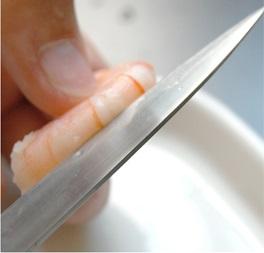 Para conseguirlo toma la gamba ya pelada y en la parte del lomo, justo en el medio, abre una incisión con el cuchillo a lo largo de todo el marisco. Después de hacerlo podrás ver la tripa, retírala con ayuda del cuchillo y pasa por agua la gamba para dejarla perfecta y lista para cocinar.