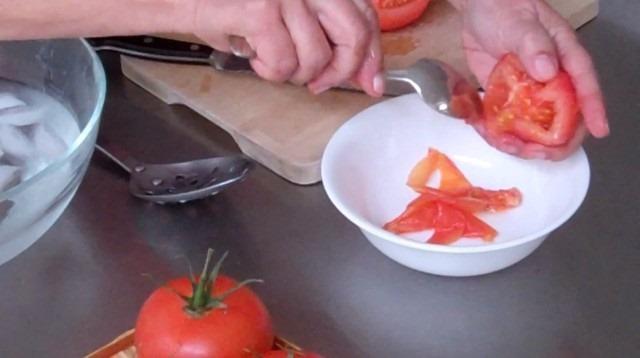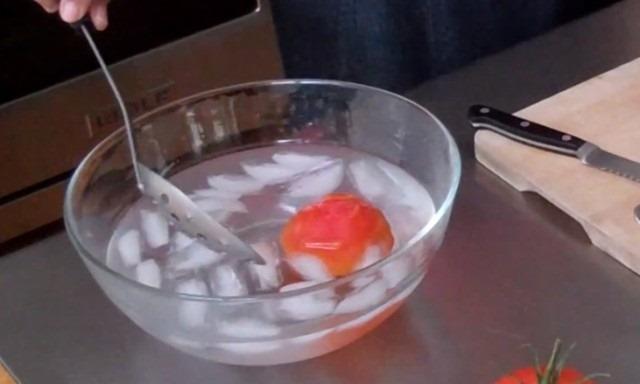 Ahora largamos suavemente el tomate en el bol con agua helada. Dejamos que se enfríe por un minuto o dos.