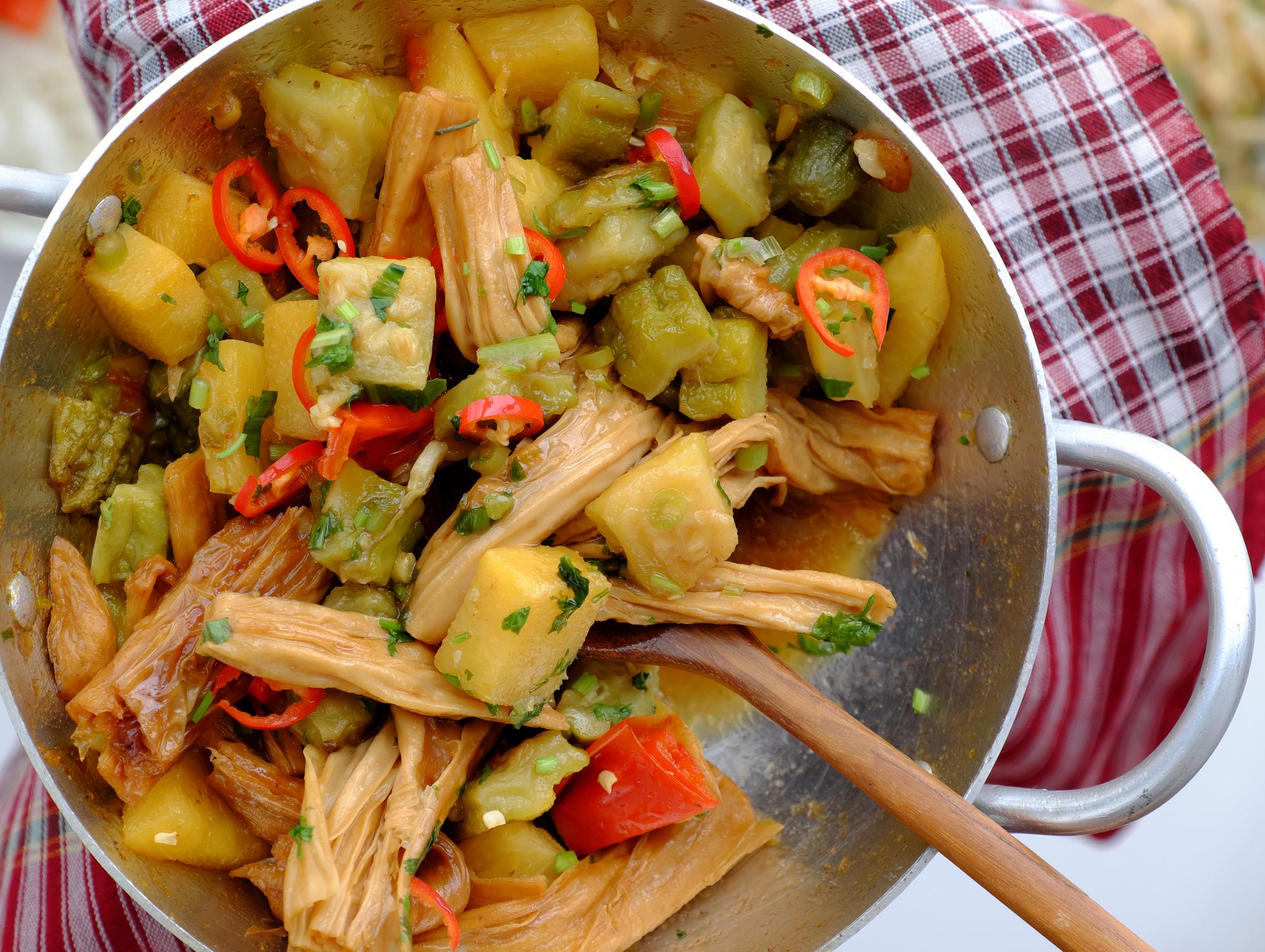 Esta Navidad, disfruta de un plato con un toque exótico en el que no falta una de las frutas tradicionales de estas fiestas: la piña. Para elaborarlo es necesario escurrir muy bien el tofu, cortarlo en tiras no demasiado gruesas y cocinarlo a la plancha, vuelta y vuelta, unos minutos. En la misma sartén, dora unos tacos de piña natural y, finalmente, prepara un aromático aderezo a base de un poco de jengibre en polvo, unas cucharadas de aceite de oliva, unas gotas de salsa de soja y el zumo de medio limón. Mezcla el tofu con la piña y alíñalos generosamente.