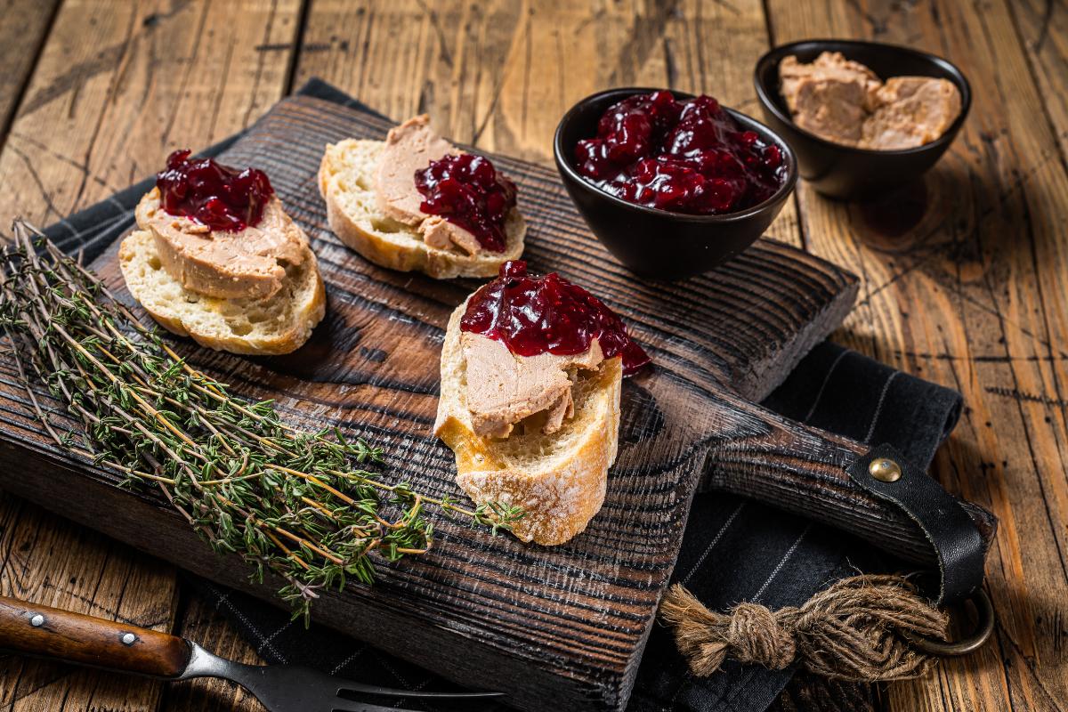 - Tosta de foie gras con queso de cabra y almendras