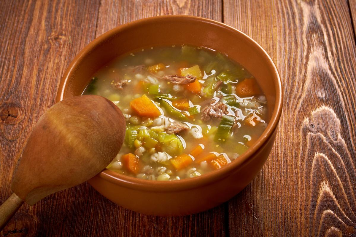 El scotch broth es una sopa escocesa clásica, ideal para los días fríos. Hecha con carne de cordero, cebada perlada, zanahorias, nabos y apio, es una sopa espesa y sustanciosa que refleja la esencia de la cocina escocesa. Este caldo, que tiene un sabor robusto, es perfecto para quienes buscan una sopa que sea casi un guiso.