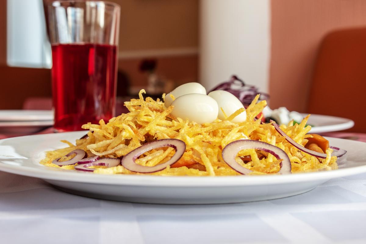 Para preparar la última idea de aperitivo con huevos de codorniz que te ofrecemos, se pelan y se cortan las patatas y la cebolla. Es preferible usar la mandolina que el cuchillo porque las tiras quedarán más finas. Luego, se agrega al gusto y se fríe en una sartén con aceite. Cuando estén crujientes se retiran. Se dejan enfriar un poco para que sea más fácil manipularlos y servirlos en un plato, haciendo una forma de nido. Luego, se fríen los huevos de codorniz y, en cada nido, se añade un huevo. Se puede complementar con lonchas finas de caña de lomo.
