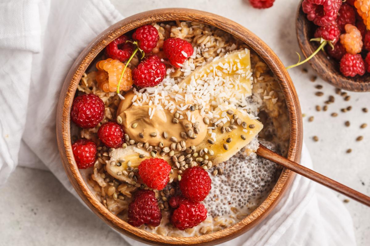 Mezcla ½ taza de copos de avena con ¾ taza de leche (o bebida vegetal), una cucharada de crema de cacahuete y una cucharadita de sirope de arce si quieres un toque dulce. Deja reposar en la nevera durante toda la noche. Por la mañana, solo añade frutos rojos frescos como frambuesas, arándanos o fresas cortadas.