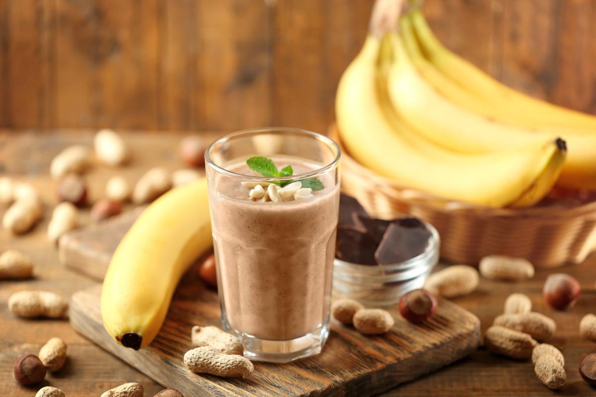 Bate un plátano maduro con una cucharada de crema de cacahuete, una cucharadita de cacao puro sin azúcar y ¾ taza de leche o bebida vegetal. Si buscas mayor consistencia y saciedad, añade un puñado de avena o una cucharada de proteína en polvo. También puedes congelar el plátano la noche anterior para conseguir una textura más espesa y refrescante.