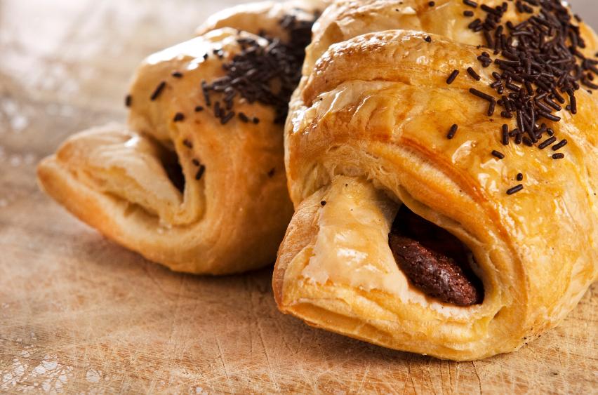 Precalienta el horno a 180 ºC y prepara una bandeja con papel para hornear o parafinado. Extiende la masa de hojaldre y con un corta pizzas haz triángulos por toda la masa, intentando que queden del mismo tamaño. Si deseas hacerlos con algún relleno es el momento de colocarlo, en este caso le agregaremos chocolate. Una vez colocado el relleno coge la parte más ancha del triángulo y comienza a enrollarlos, colocando las puntas hacia adentro. Haz el mismo procedimiento con el resto, ahora bate un huevo y pinta los croissants. Lleva la bandeja al horno y déjalos cocinar por 15 o 20 minutos.