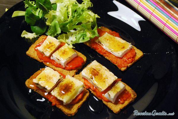 Para preparar este pincho tan solo deberás mezclar queso fresco en crema con una lata de bonito. Corta y tuesta rebanadas de pan y úntalas con la deliciosa mezcla. Para acabar decora el canapé con una tira de pimiento del piquillo. ¡Delicioso!