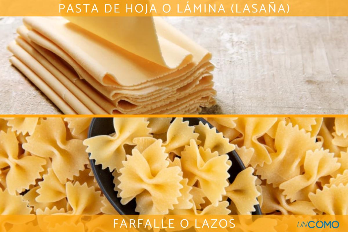 La lasaña es la pasta más conocida en forma de hoja o lámina. Se trata de unas láminas que contienen de manera intercalada diferentes ingredientes (desde verduras a pescados y carnes). En su elaboración, es imprescindible añadir bechamel y queso rallado para que quede bien gratinada en el horno.