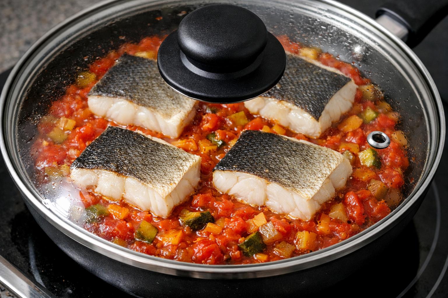 Cuando el pisto esté listo y las verduras estén tiernas, coloca los lomos de bacalao encima con la piel hacia abajo. Tapa la sartén o cazuela y deja que el pescado se cocine con el calor del guiso durante unos 6 o 8 minutos, dependiendo del grosor de los lomos.