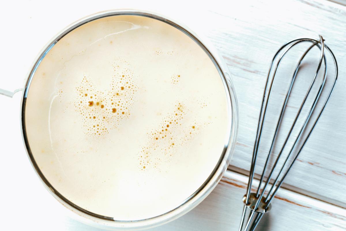 Empezamos la elaboración del Bolo Rei activando la levadura. Disuelve la levadura en la leche tibia junto a una cucharadita de azúcar. Deja reposar 10 minutos hasta que empiece a espumar.