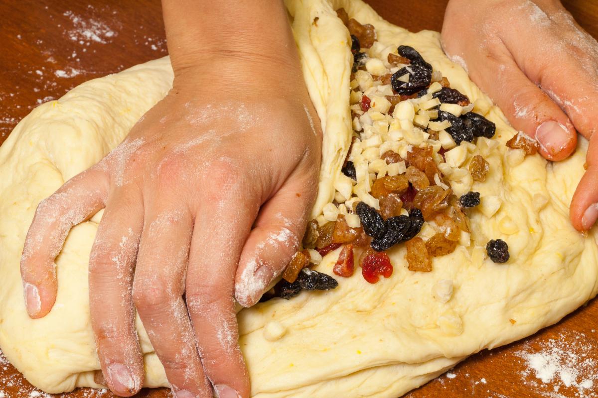 Tras el primer levado, incorpora el relleno a la masa. Es decir, agrega las frutas confitadas troceadas, las pasas y los frutos secos. Amasa suavemente para que los ingredientes se repartan de forma uniforme por la masa.