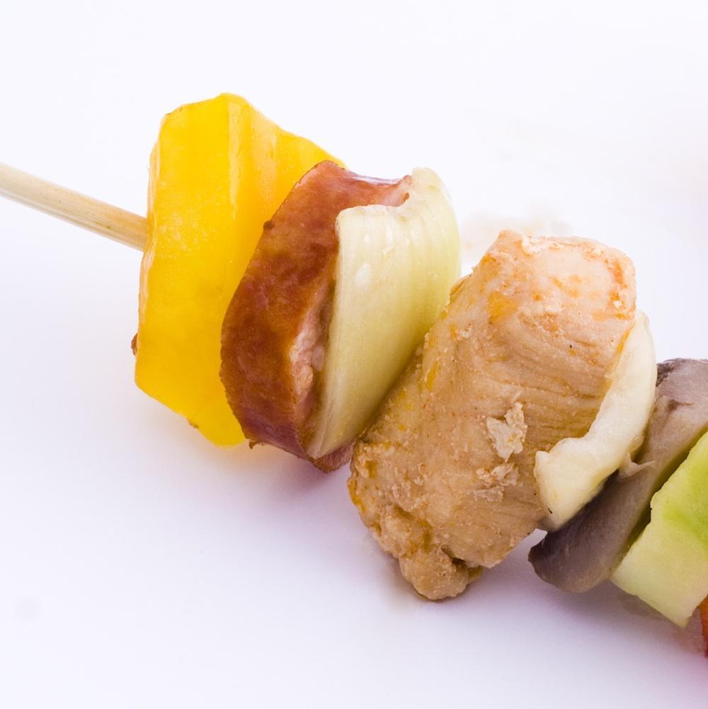 Distribuir alternativamente en la brocheta, que puede ser de madera o de metal, lo que disponga, los dados de piña y de pollo.
