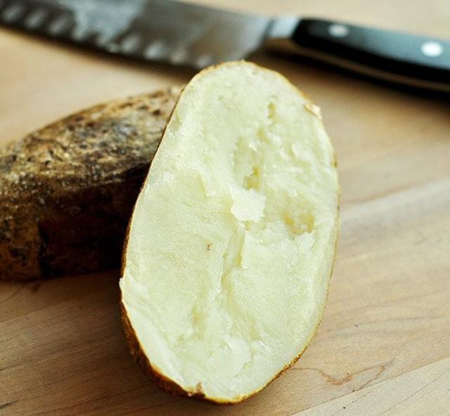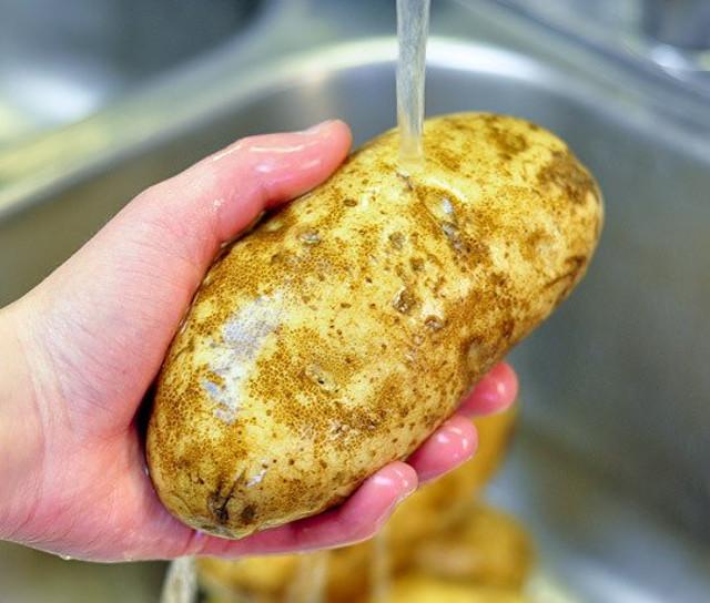 Pincha las papas en algunos lugares con los dientes de un tenedor. Esto permite la salida del vapor durante la cocción.