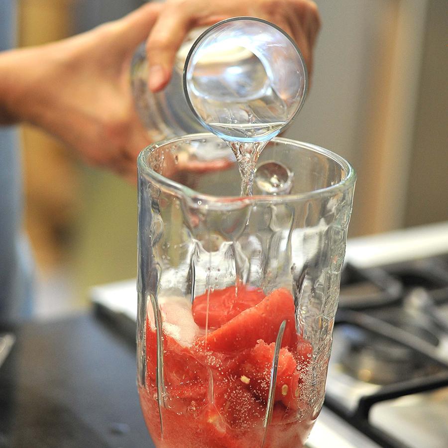 Introduce los trozos de sandía en un recipiente de borde alto o licuadora. Si es necesario, hazlo en dos veces. Incorpora, también, dos tazas de agua y bátelo hasta que la sandía esté completamente triturada. Vierte el resto de agua y sigue batiendo.