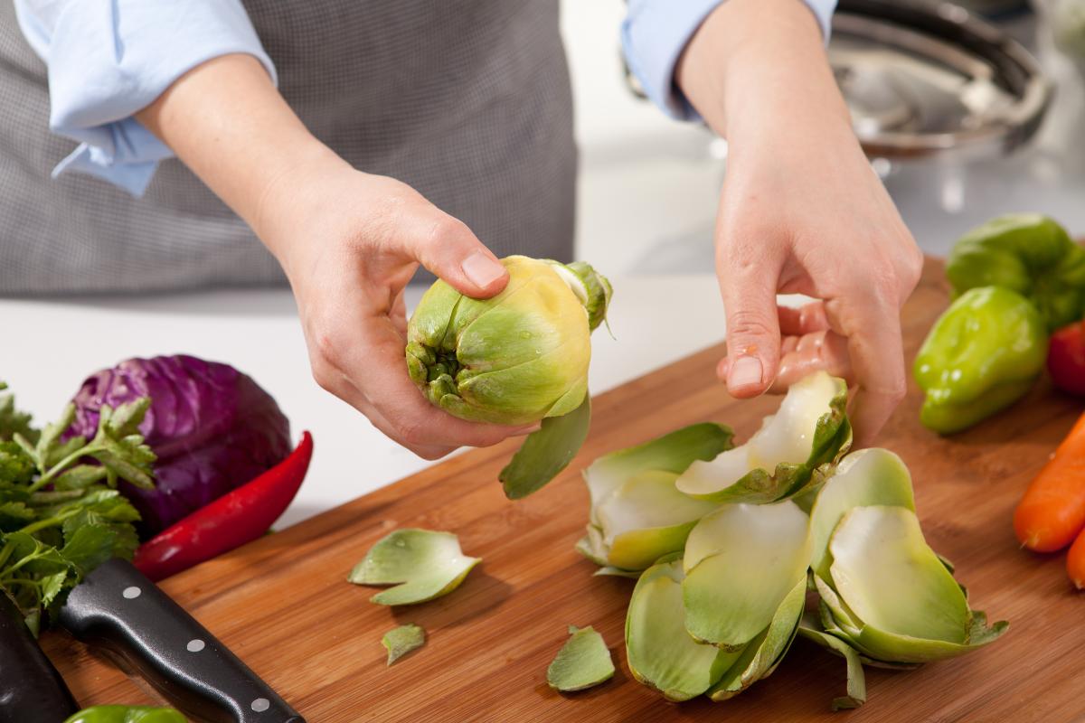 Limpia las alcachofas con cuidado. Para ello, se debe remover las hojas que la cubren y llegar a la capa con el color verde más claro, ya que estas son más tiernas. Luego, procede a pelar el tronco, el cual no debe ser desechado sino conservado, y córtale la punta.