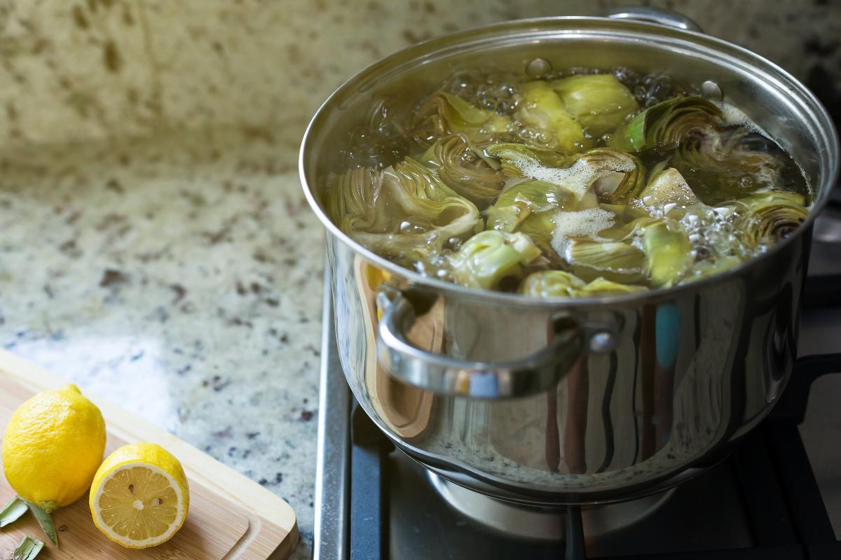Coloca el agua en un bol y agrega la sal. Se debe dejar hirviendo para luego añadir las alcachofas y dejarlas en hervor durante 8 minutos.