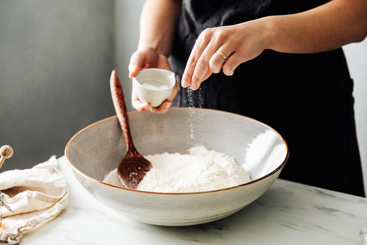 Agrega la harina de trigo, la cual se debe tamizar previamente, y un poco de sal. Esto se mezcla hasta que se obtiene una masa homogénea y espesa. En este paso, con la masa lista para el rebozado, agrega el cubito de hielo para que se conserve fría.
