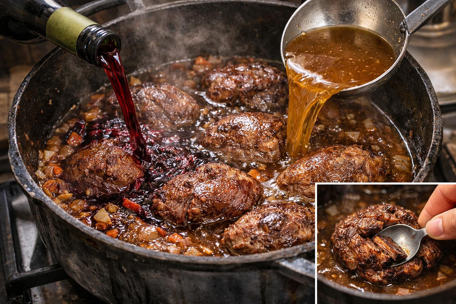Reincorpora las carrilleras a la olla y vierte el vino tinto. Sube el fuego un par de minutos para que se evapore el alcohol y luego añade caldo de carne hasta cubrir la carne. Tapa y deja cocer a fuego suave durante unos 45-60 minutos (o 20 min si usas olla express) hasta que la carne esté muy tierna. Si quieres una carrillera con arroz espectacular, la carne debe poder cortarse casi con el borde de la cuchara antes de añadir el grano.