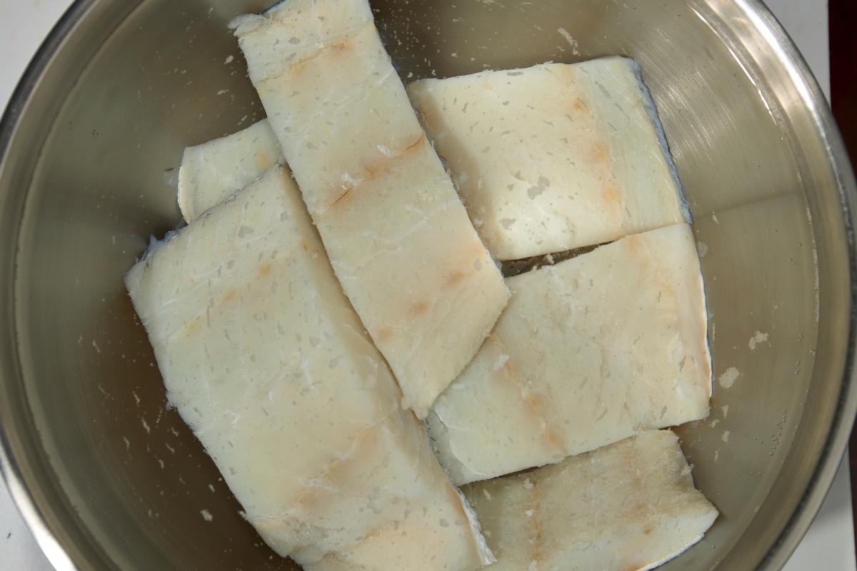 Si usas bacalao en salazón, tendrás que desalarlo con antelación. Para ello, enjuágalo bajo el grifo y déjalo en agua fría durante 24-36 horas, cambiando el agua cada 8 horas. Si utilizas bacalao ya desalado o congelado, este paso no es necesario.