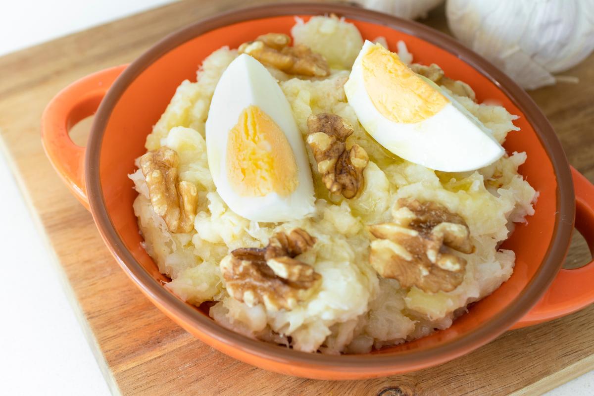 - Decoración tradicional: los huevos duros y las nueces no son solo decorativos, aportan textura y equilibrio al sabor.