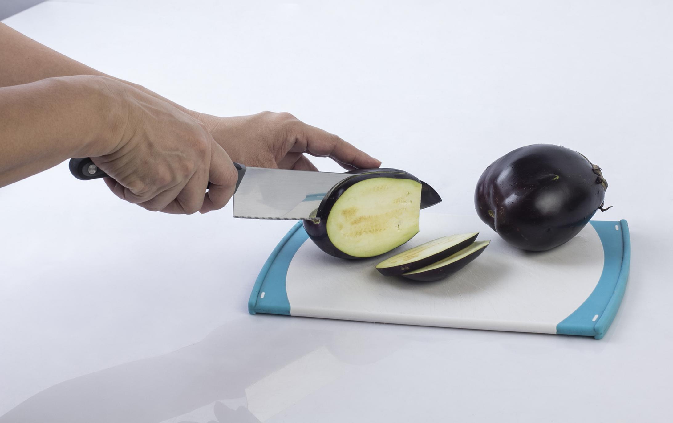 Pasa un paño húmedo por las berenjenas para retirar polvo y partículas de suciedad. En una tabla corta primero los extremos (punta y tramo final) y, seguidamente, trocéala en rodajas no muy gordas, como de medio centímetro, sin retirar la piel. Si lo prefieres, también puedes cortarlas longitudinalmente.