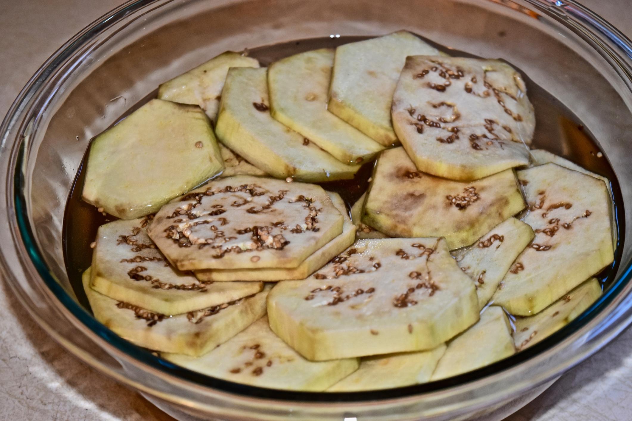 Para que las berenjenas a la parmesana queden bien, es importante quitar el amargor propio de la hortaliza. Para hacerlo, pon las rodajas en un bol con agua y un puñado de sal gorda. Tenlas unos 10 minutos. Pasado este tiempo sácalas del agua, escurre con ayuda de un colador grande y termina de secarlas con papel absorbente.