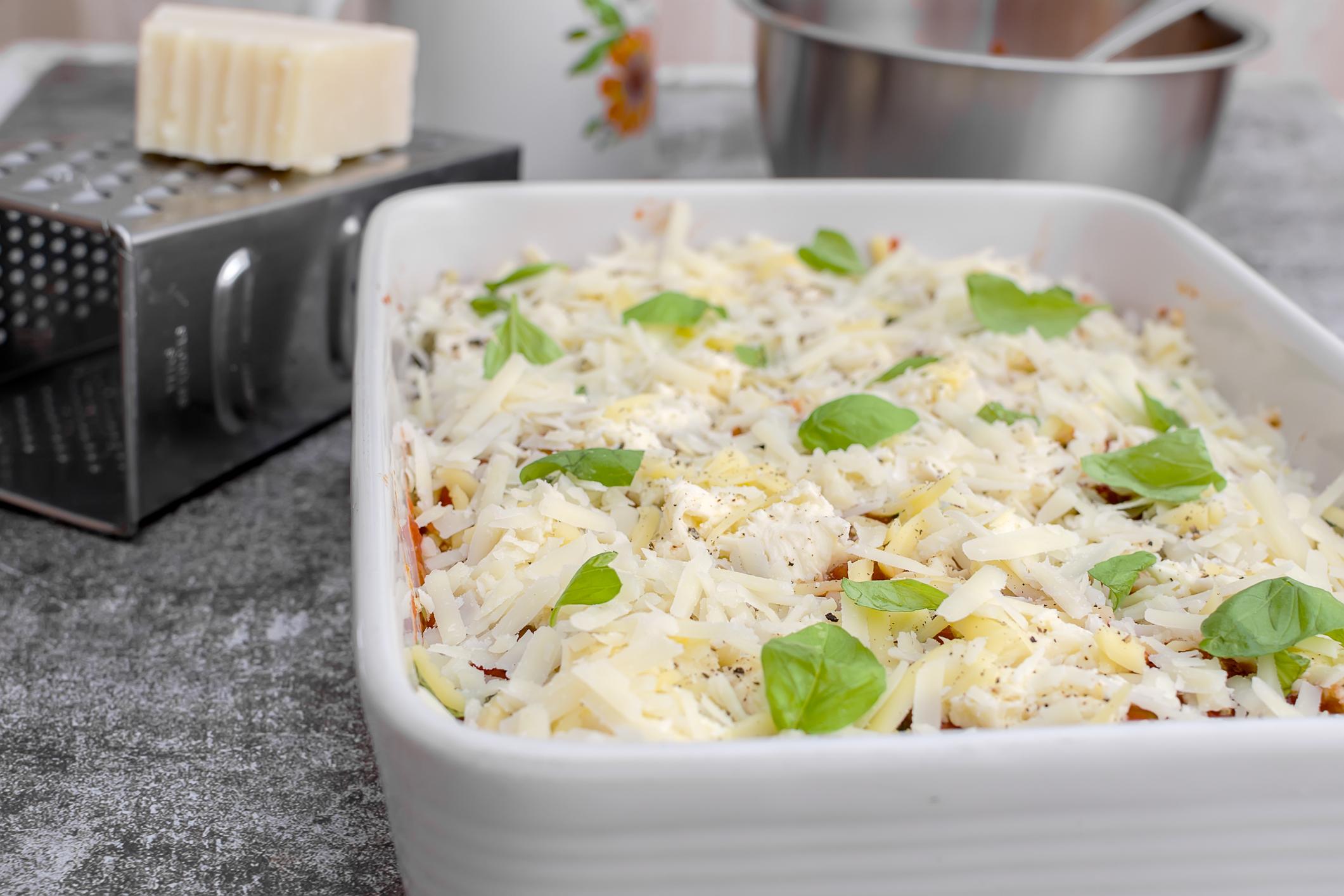 Prepara el resto de ingredientes: el tomate frito, el queso parmesano rallado y la mozzarella cortada en finas lonchas. Si quieres añadir albahaca fresca, pícala y tenla también a mano.
