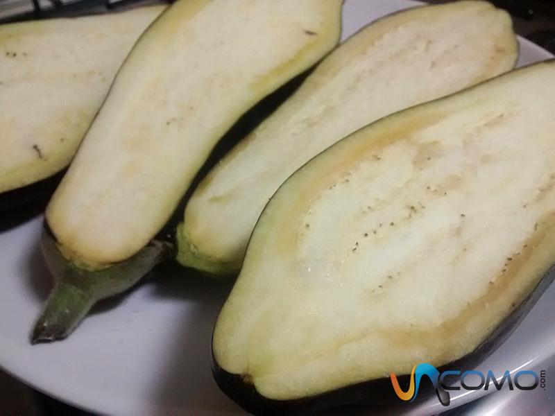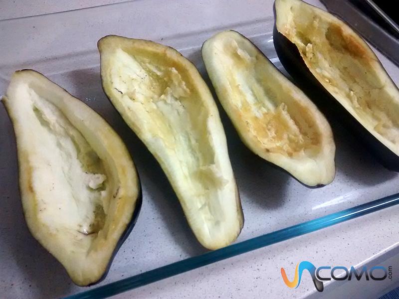 Pasado el tiempo, saca las berenjenas del horno y retira la carne con la ayuda de un cuchillo o cuchara. Debes ir con mucho cuidado para no romper la piel, ya que servirá de recipiente para las berenjenas rellenas.