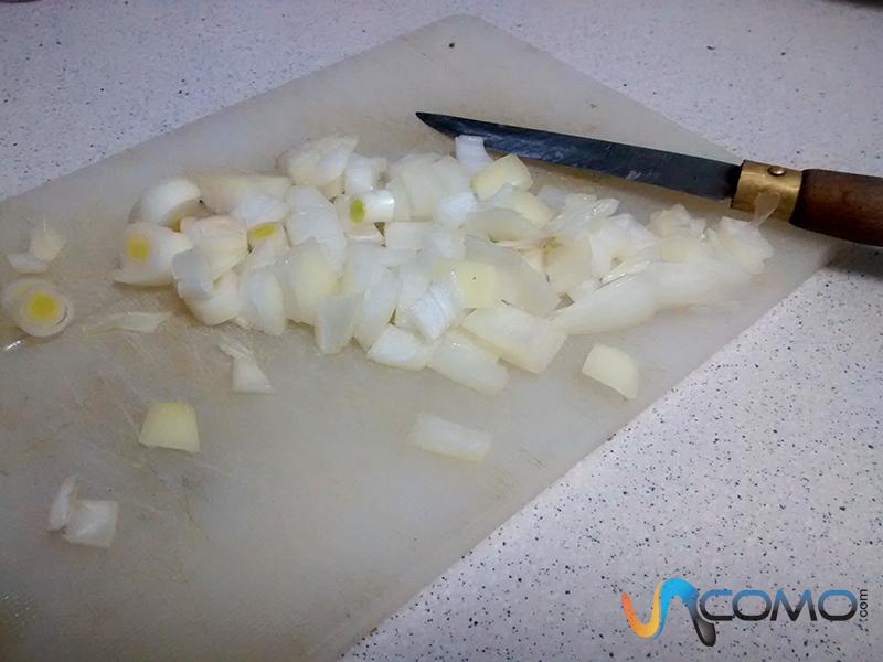 A continuación, pica la cebolla bien pequeña, añádele sal y sofríela en una sartén, hasta que empiece a dorarse. Será muy importante que mantengas el fuego a potencia mínima para que la cebolla se cocine pero no se queme.