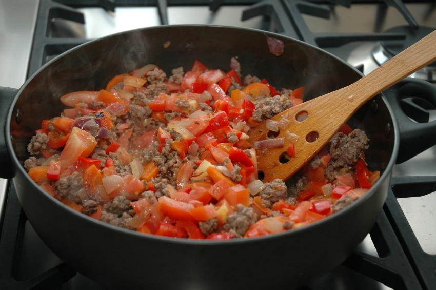 Añade la carne picada (de ternera, cerdo, mixta, pollo...) en la sartén; dale vueltas con una espátula de madera hasta que coja color. En otra sartén sin aceite (para evitar que se quemen las verduras), dora el beicon y cuando esté listo, añádelo a la mezcla de la carne picada y las verduras.