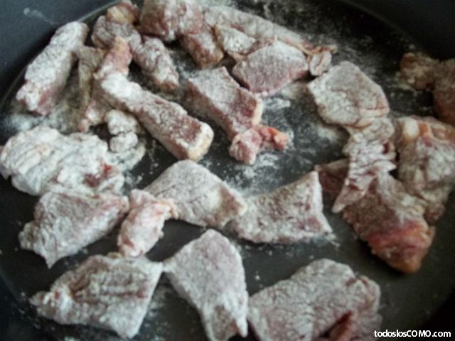 Comienza limpiando la carne, ya que tendrá bastante grasa en la parte de arriba y debes retirarla con la ayuda de un cuchillo. Luego, corta la carne en trozos de unos 2 centímetros de largo y ancho, como un cubo, y sazona con sal y pimienta. Pon la harina en un plato y pasa cada trozo de carne por ella, quitando el exceso de esta dándole unas palmaditas.