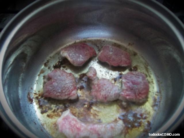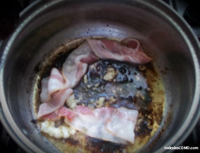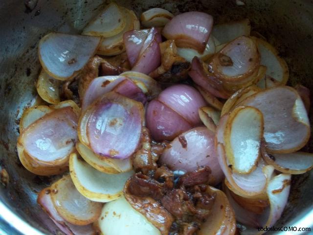 Sella toda la carne y reserva a un lado. A continuación, corta las cebollas en mitades y pon el tocino en la olla. Remueve un poco para que todos los ingredientes vayan cogiendo el sabor de los demás.