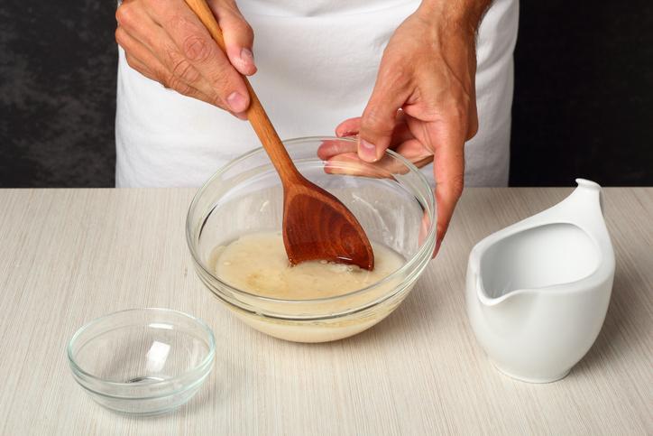 Ahora sí, ¡empezamos con el pan brioche casero con levadura fresca! Primero, empieza mezclando la levadura fresca con el agua o la leche. Hazlo en un recipiente con suficiente capacidad. En otro recipiente más pequeño, tamiza la harina y mézclala con la leche en polvo y el azúcar (si te decantaste por esta opción).